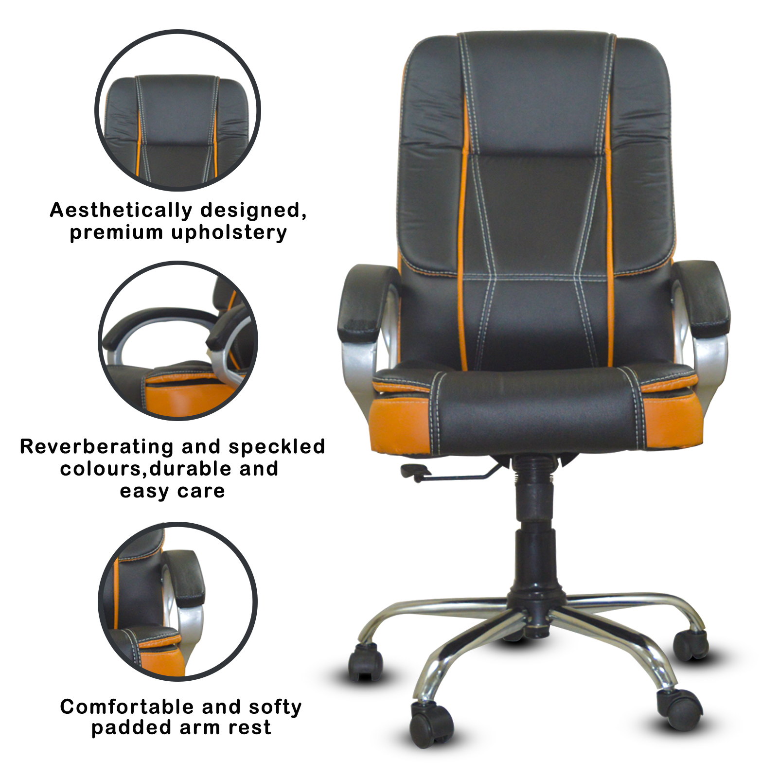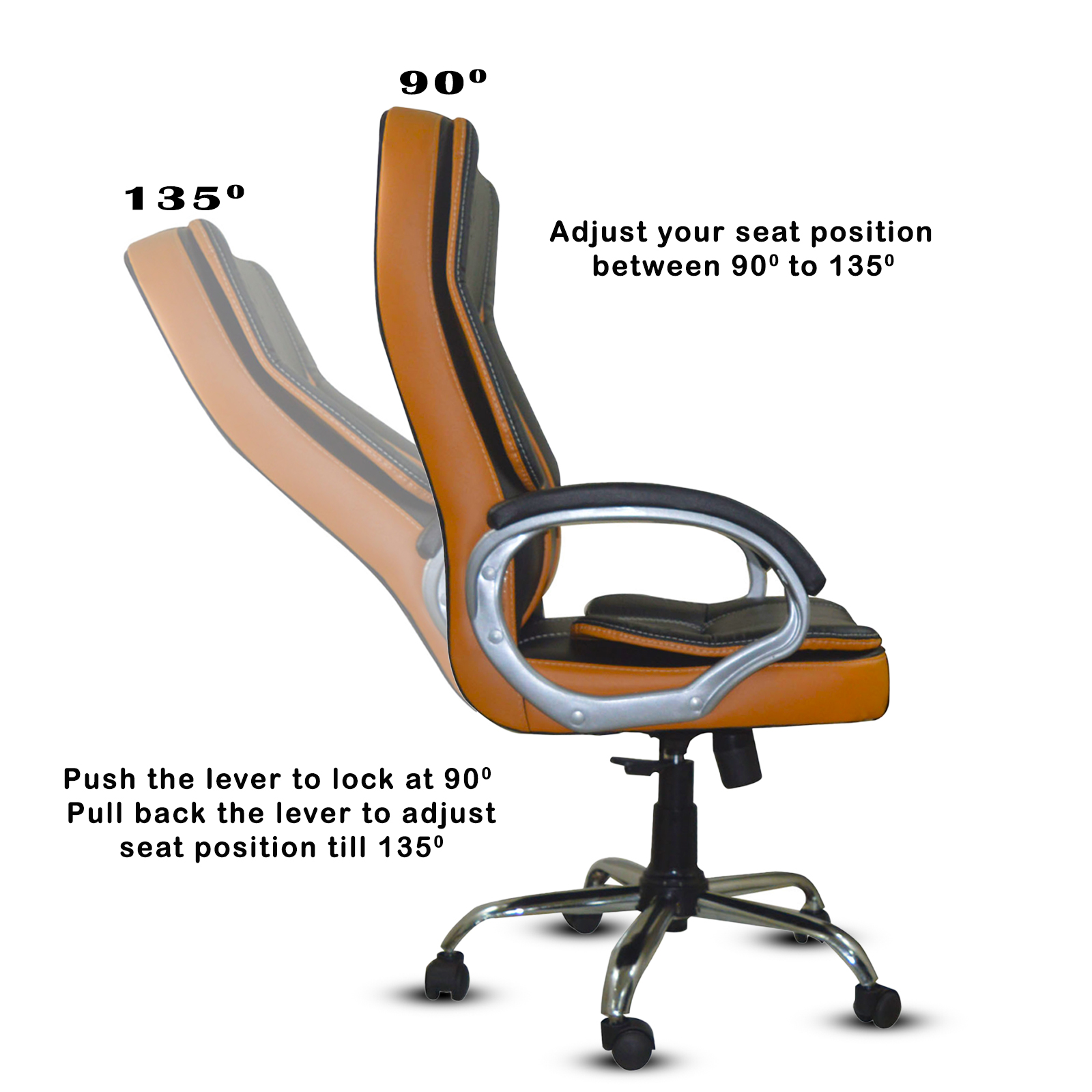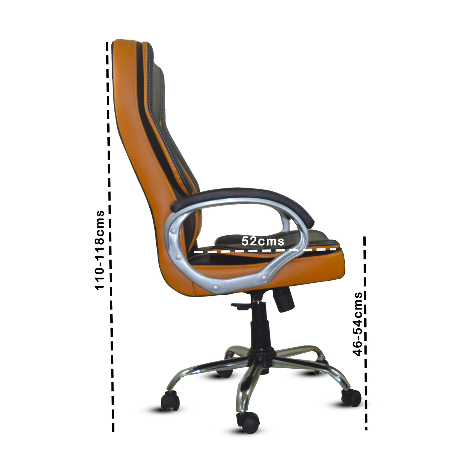 Specifications – Internal seat material : | filled with – high density foam | Seat cover: leatherette | Color: super black and orange brown | Size: high back | tilt lock | gas-lift: class 4 | base: heavy duty metal base | Castors: nylon dual color wheels | Maximum weight capacity: up to 120 kgs | Height adjustment : 35-40 inches | Seat height : 19-23 inches | Seat width:19 inches |Seat depth : 18 inches | Back height : 18 inches |