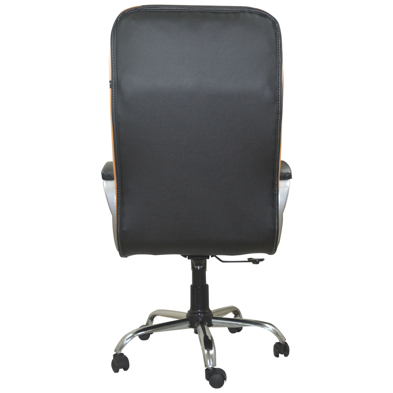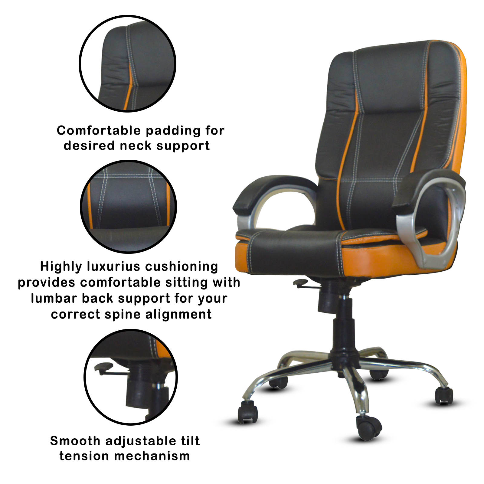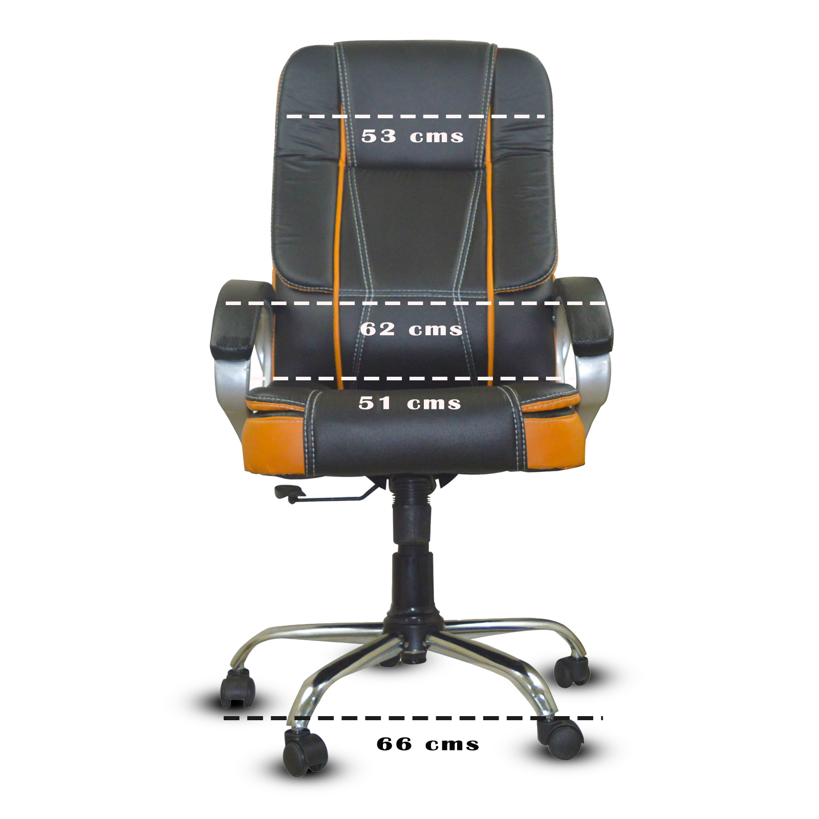Specifications – Internal seat material : | filled with – high density foam | Seat cover: leatherette | Color: super black and orange brown | Size: high back | tilt lock | gas-lift: class 4 | base: heavy duty metal base | Castors: nylon dual color wheels | Maximum weight capacity: up to 120 kgs | Height adjustment : 35-40 inches | Seat height : 19-23 inches | Seat width:19 inches |Seat depth : 18 inches | Back height : 18 inches |