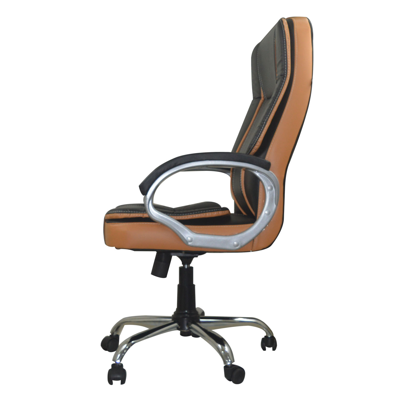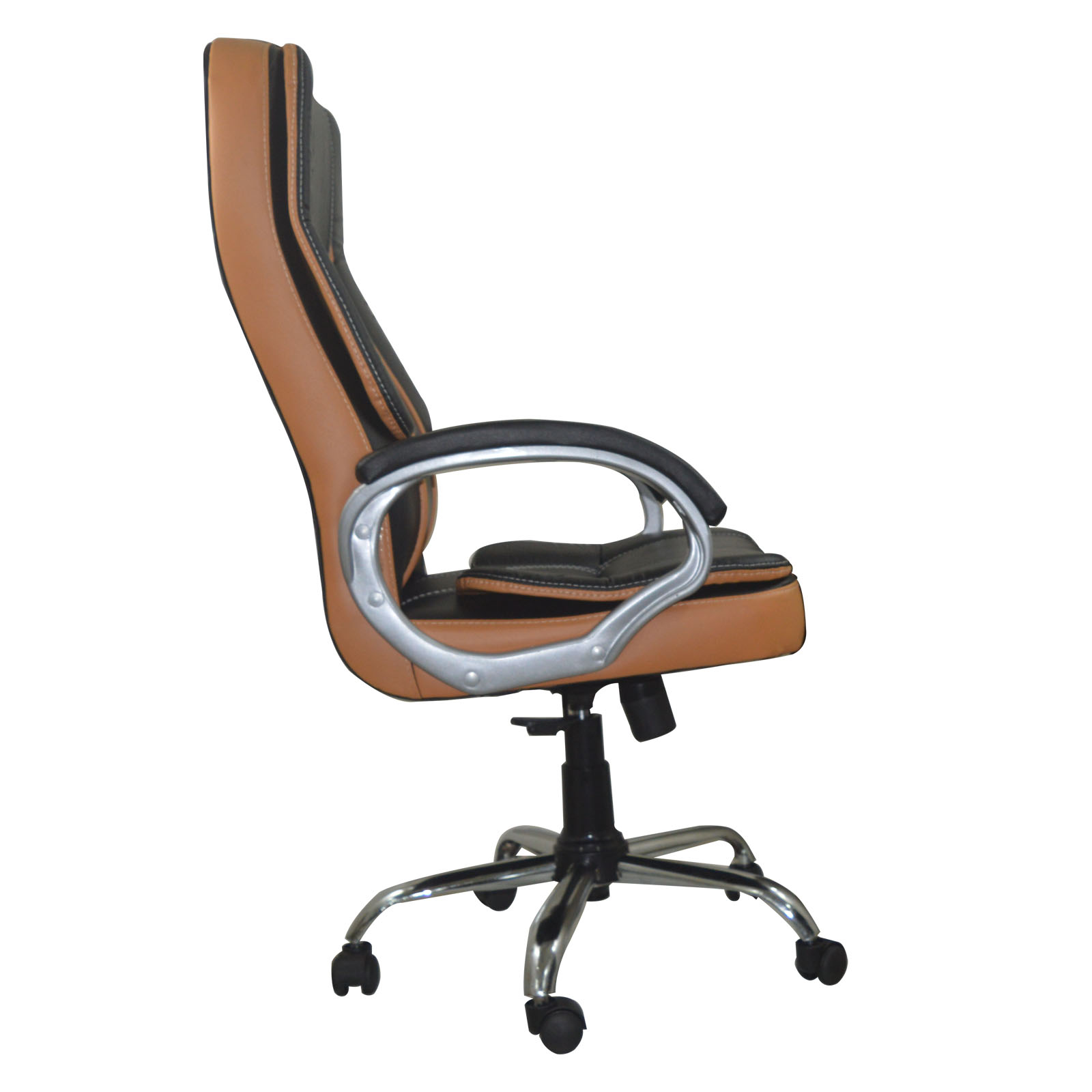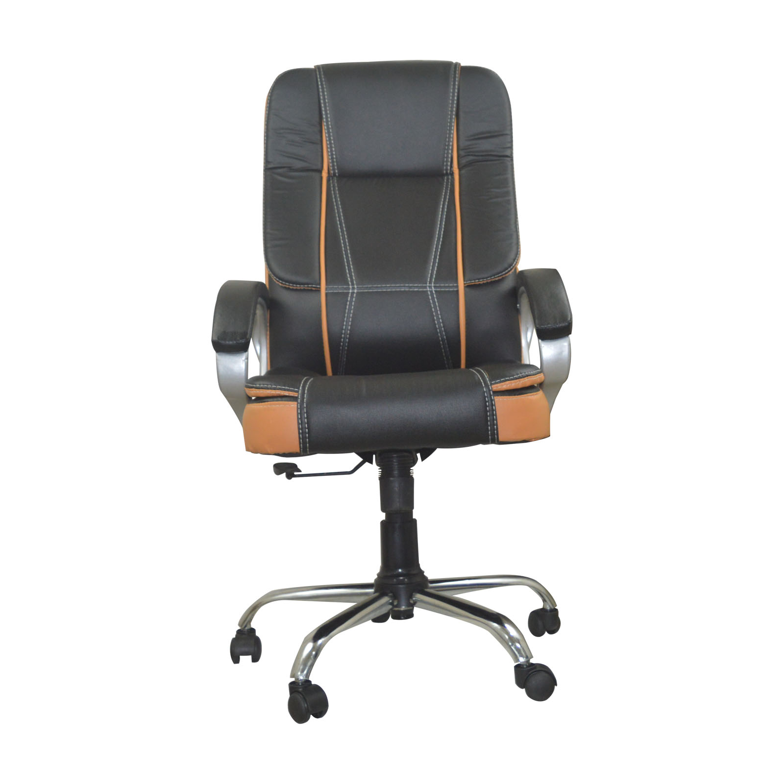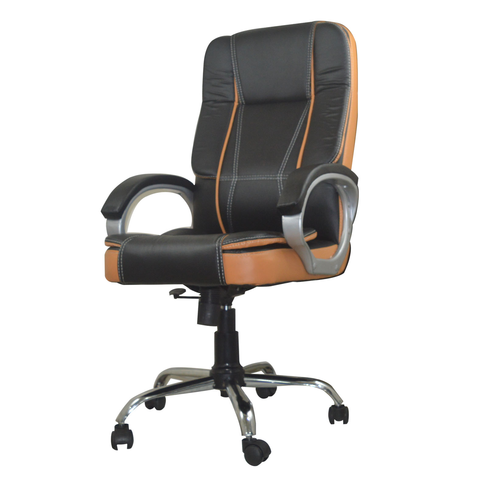 Revolving premium leatherette high back ergonomic chair with high level comfort seating, adjustable height and heavy duty metal base, available in dual tone color options  [super black and orange brown]