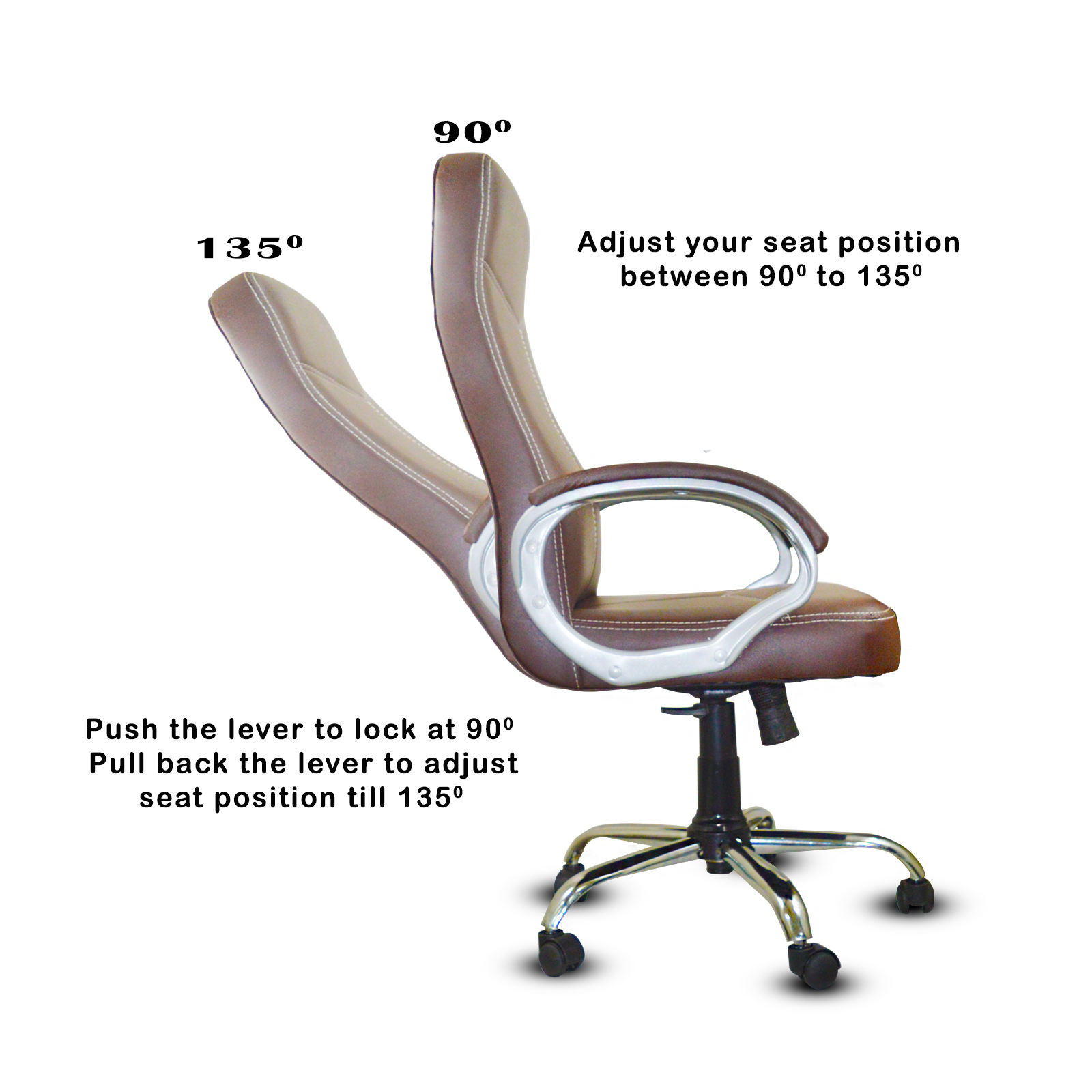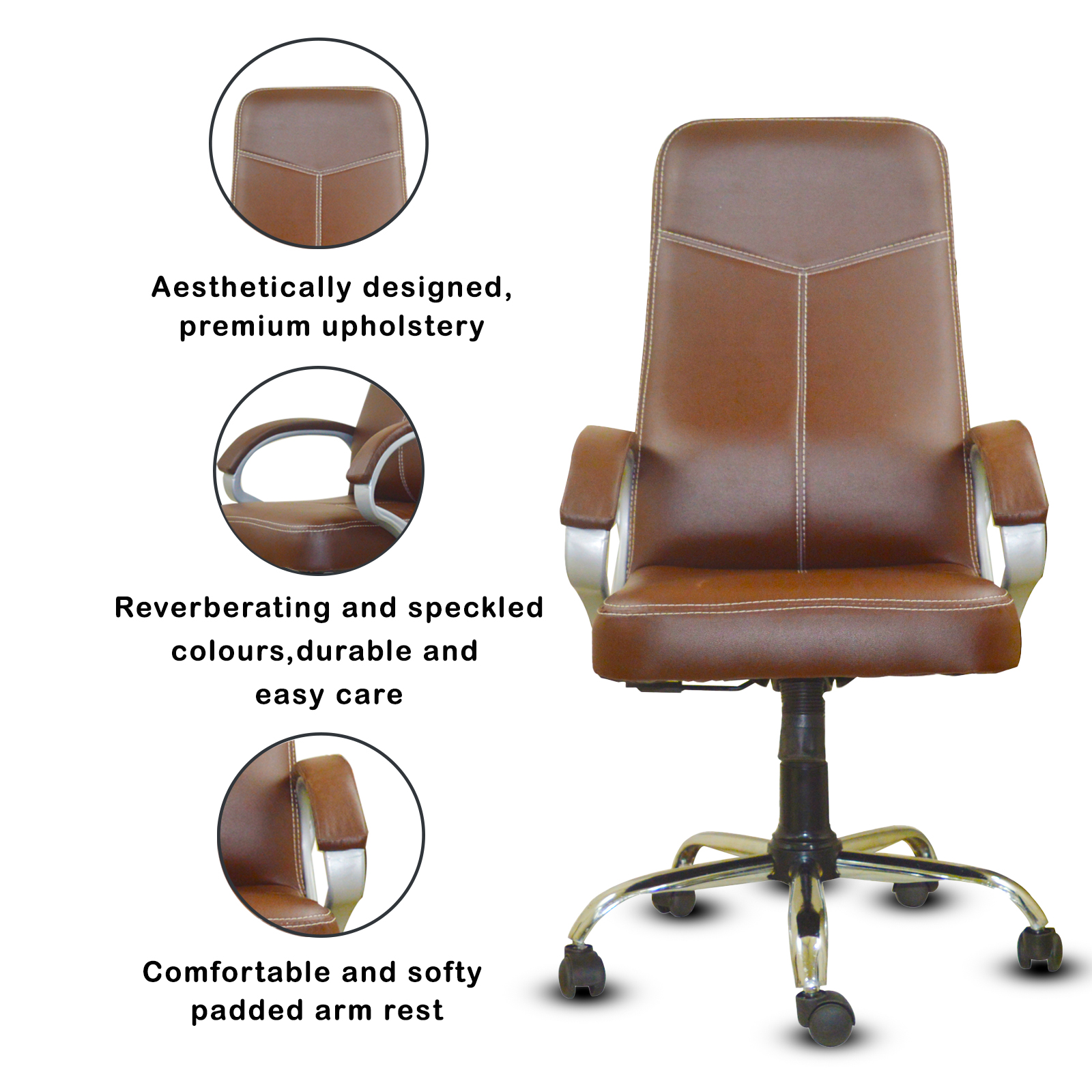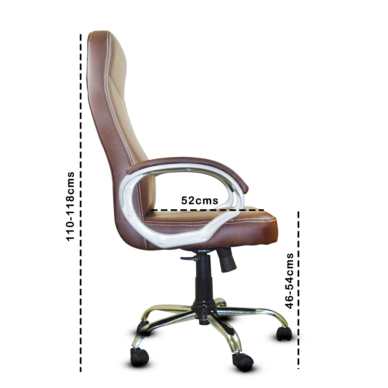 Specifications – Internal seat material : | Filled with – high density foam | Seat cover: leatherette | Color: dark brown | Size: high back | tilt lock | gas-lift: class 4 | Base: heavy duty metal base | Castors: nylon dual color wheels | Maximum weight capacity: up to 120 kgs | Height adjustment : 35-40 inches | Seat height : 19-23 inches | Seat width:19 inches |Seat depth : 18 inches | Back height : 18 inches |
