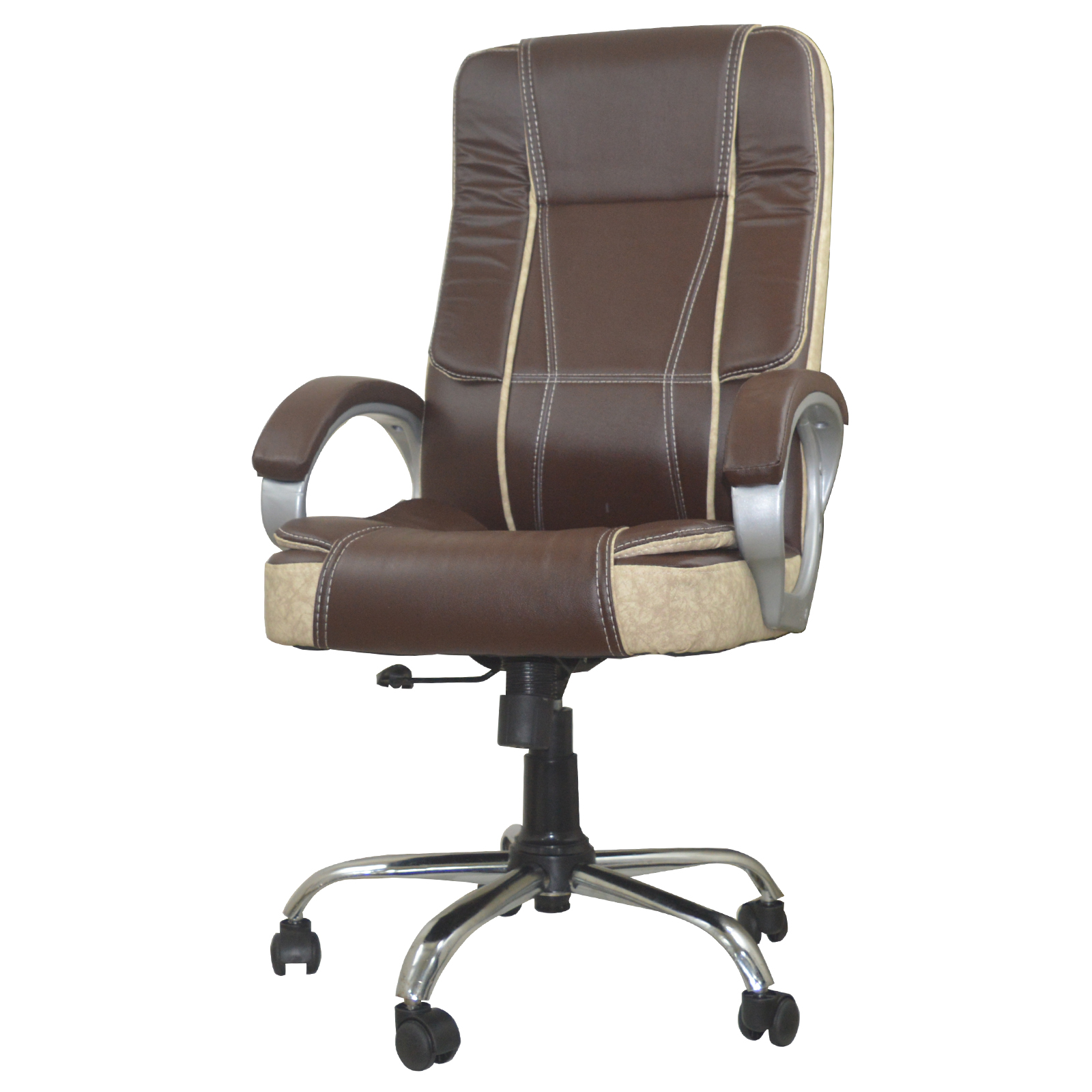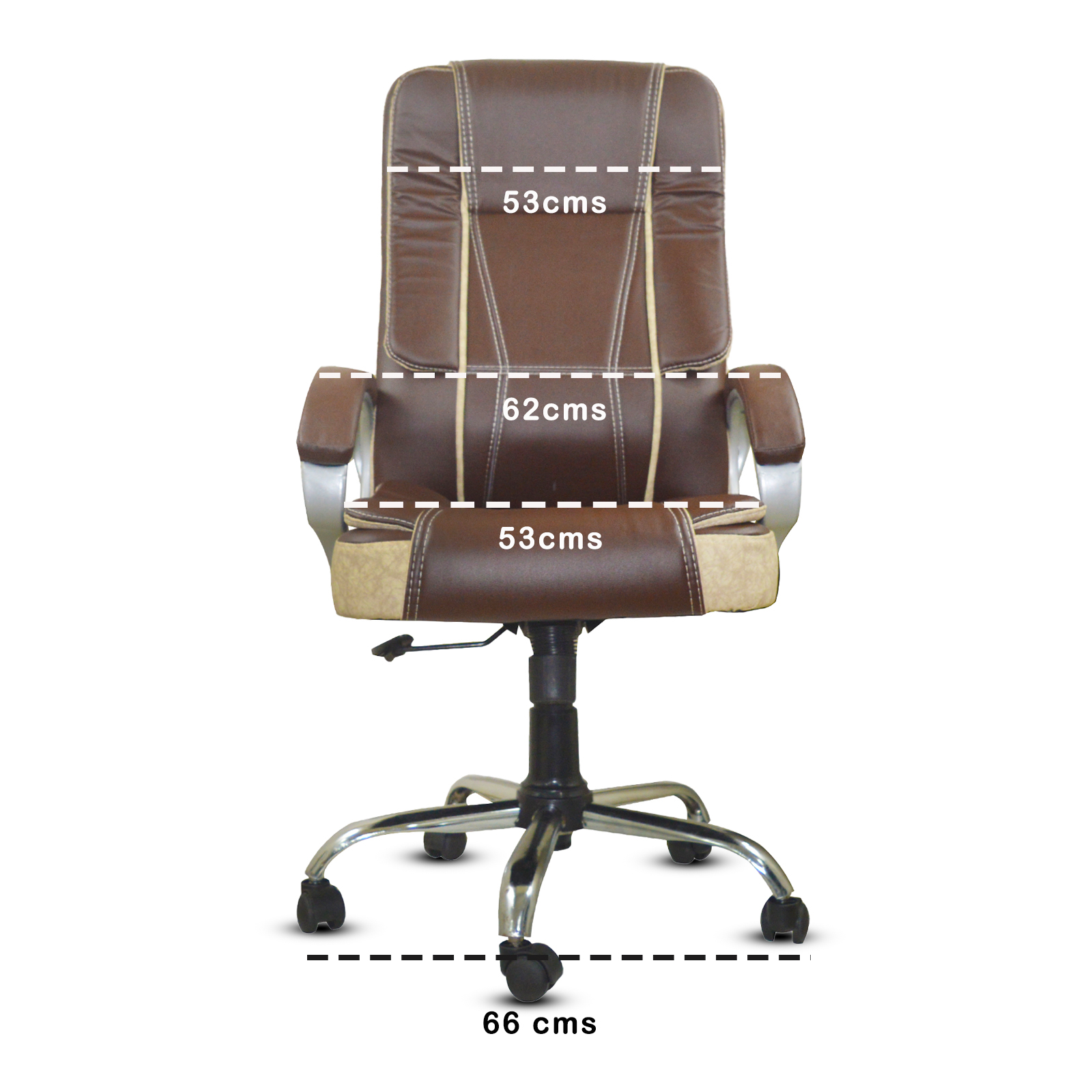 Specifications – Internal seat material : | Filled with – high density foam | Seat cover: leatherette | Color: nutmeg brown and light grey | Size: high back | tilt lock | gas-lift: class 4 | Base: heavy duty metal base | Castors: nylon dual color wheels | Maximum weight capacity: up to 120 kgs | Height adjustment : 35-40 inches | Seat height : 19-23 inches | Seat width:19 inches |Seat depth : 18 inches | Back height : 18 inches |
