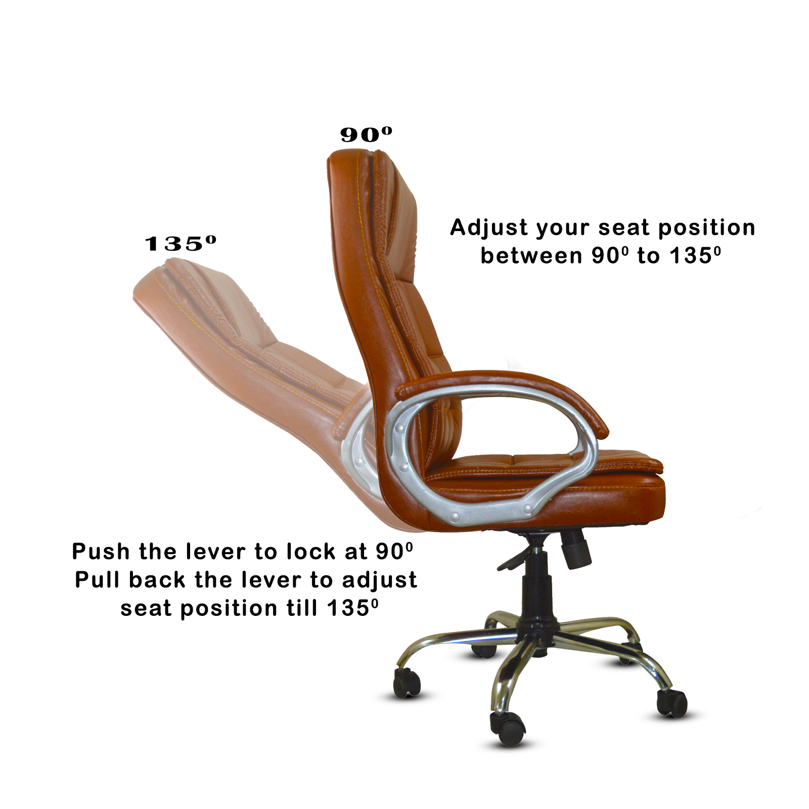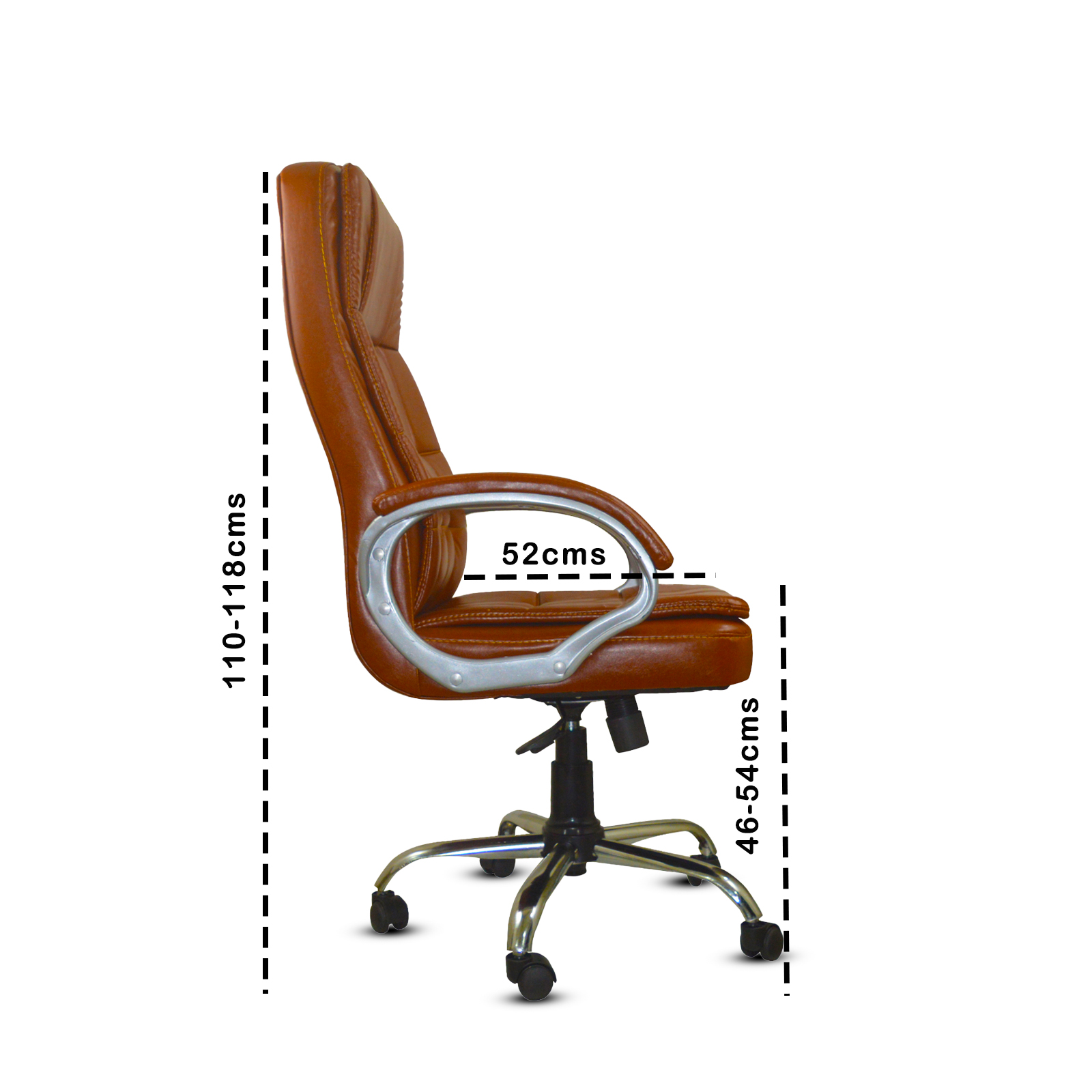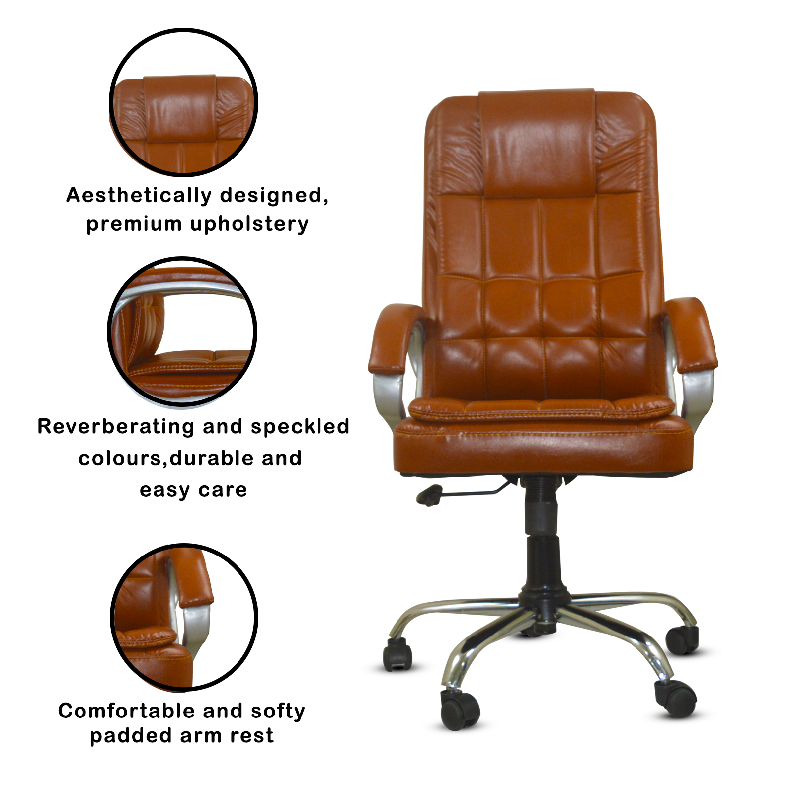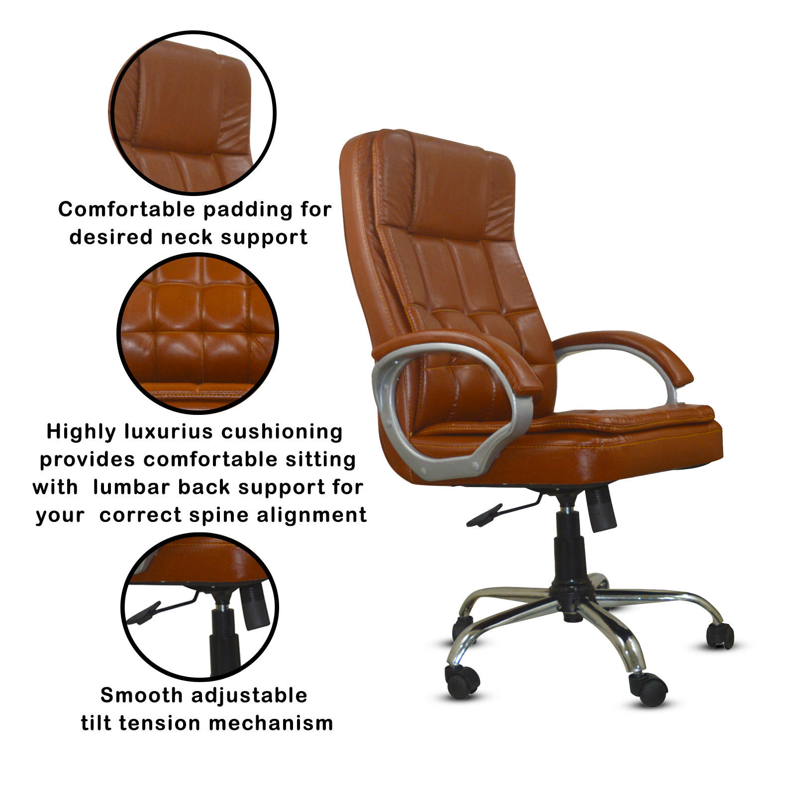 Specifications – Internal seat material : | Filled with – high density foam | Seat cover: leatherette | Color: choco brown | Size: high back | tilt lock | gas-lift: class 4 | Base: heavy duty metal base | Castors: nylon dual color wheels | Maximum weight capacity: up to 120 kgs | Height adjustment : 35-40 inches | Seat height : 19-23 inches | Seat width: 19 inches |Seat depth : 18 inches | Back height : 18 inches |